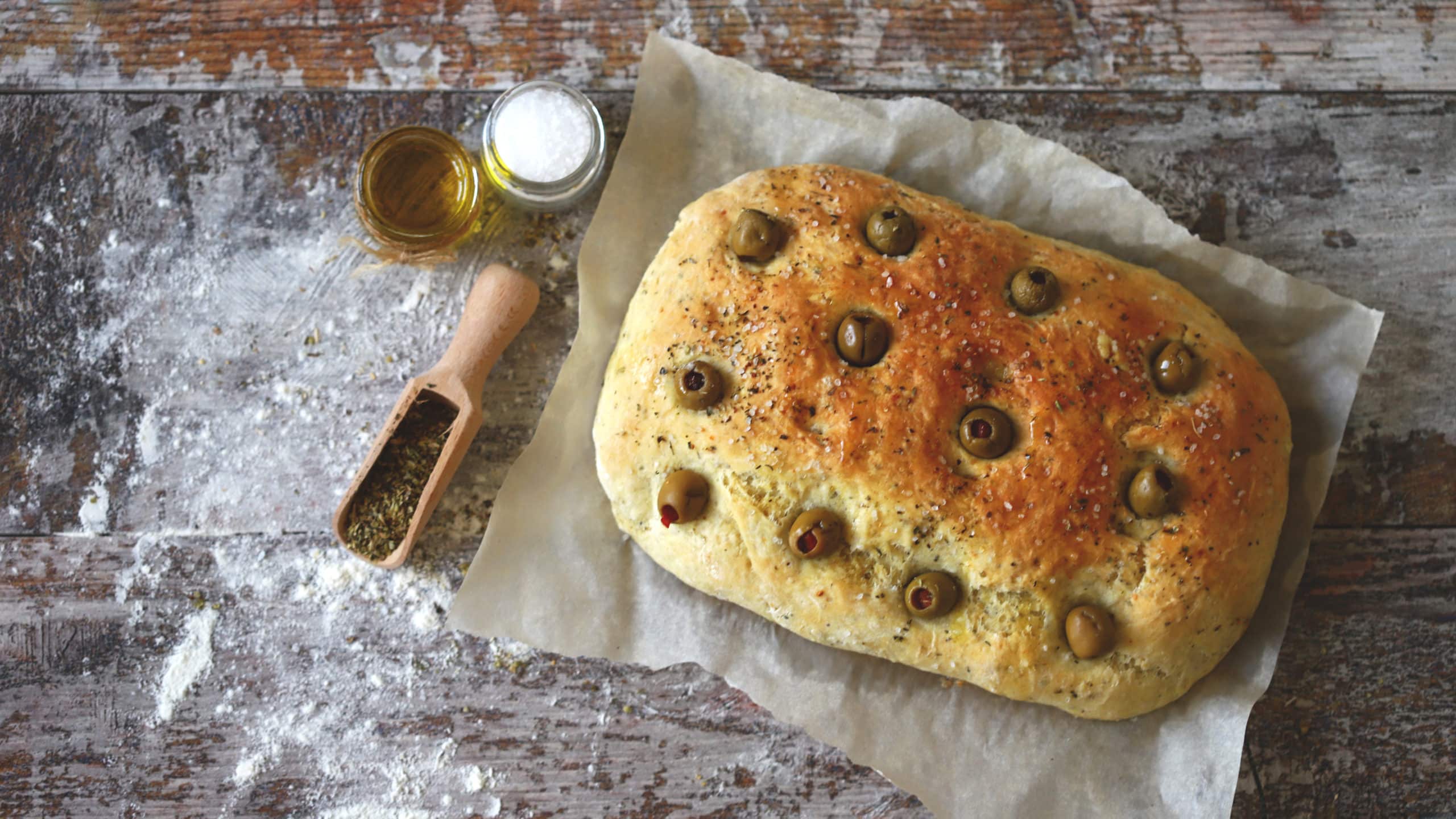 Drizzle the top of the dough generously with olive oil, ensuring the dimples are filled. Sprinkle sea salt flakes over the top of the dough, add the stuffed olives, pressing them gently into the surface. Optionally, you can also sprinkle fresh rosemary leaves on top for added flavour and aroma.
